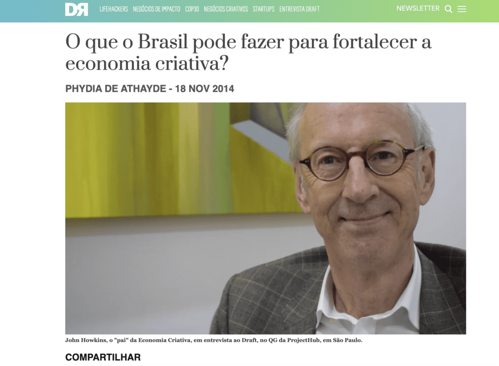 Em 2012 (e anos subsequentes), a ProjectHub já atuava no Brasil como uma plataforma de conexão entre criatividade, empreendedorismo, organizações e agentes de impacto. Foi ali, naquele ambiente imerso em projetos criativos, diálogos sobre economia criativa e ecossistemas de inovação, que a organização recebeu John Howkins, um dos principais teóricos e autoridades globais em economia criativa, para uma entrevista intensa e seminal sobre os temas que hoje sustentam o World Creativity Day.
